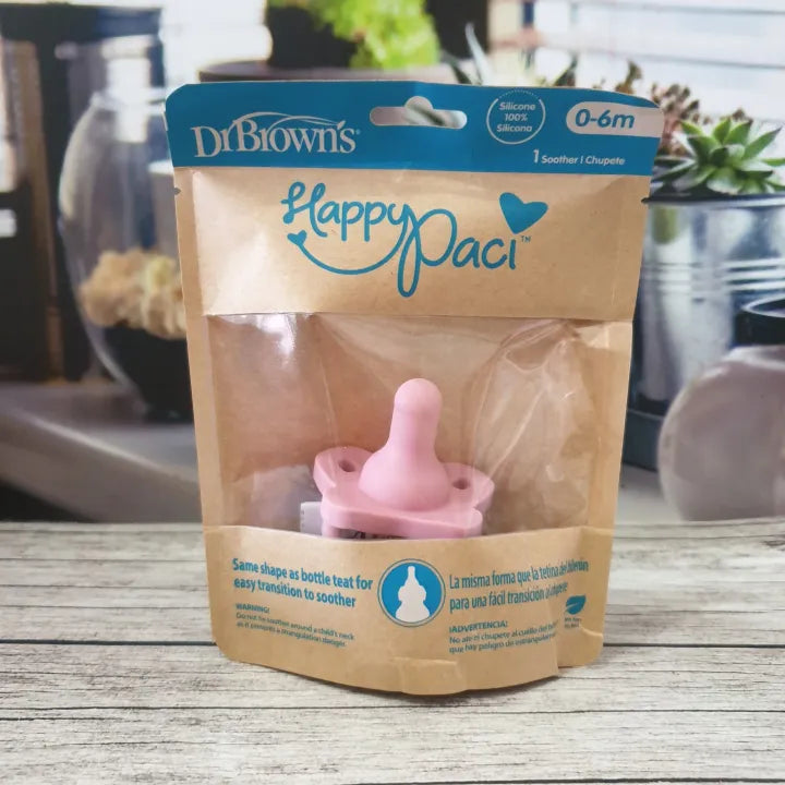 Soothing baby is simplified with Dr. Brown's HappyPaci - the soft silicone pacifier shaped like Dr. Brown's bottle nipple. Introducing baby to a pacifier is made easy with the familiar Dr. Brown's shape baby is used to. Plus, moms love the one-piece construction of the HappyPaci.
